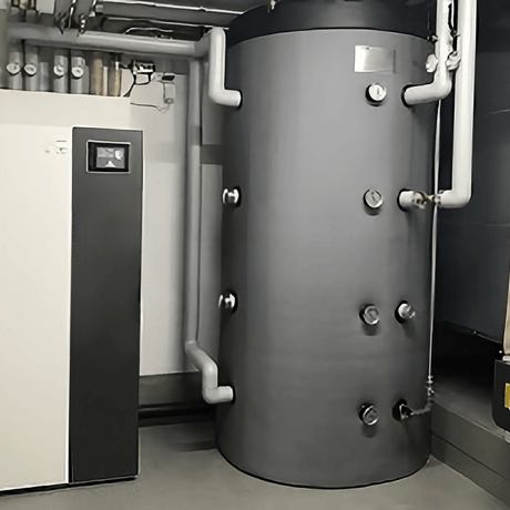 Tanque de almacenamiento de energía sin intercambiador de calor para sistemas de calefacción, energía solar y combustibles sólidos. Volumen: 1000 litros, aislamiento: espuma superrígida de poliuretano de 100 mm.